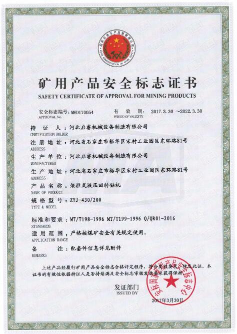 陕西榆林杨经理矿上需要3台液压探水钻机,产品经理了解其地质环境、作业需求后推荐的ZYJ-430/200液压架柱式回转钻机。杨经理确认打孔深度、钻孔直径等这些实际性能符合需求后,才想起问是否有安全证书,矿上只采购有安全证书的设备,没有安全证书,性能再好、价格再实在也不行!!启睿必须自信的回答:有啊!咱ZYJ-430/200液压架柱式钻机可是有“身份证”的钻机!