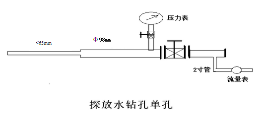 根据防治水相关规定,煤层探放水的止水套管长度选为10米。开孔采用φ42钻杆,φ108金刚石钻头钻进,钻进10.0m后,冲洗钻孔,下入φ98套管,套管长度6m,套管外口焊接法兰盘,套管用水泥浆固定,扫出管内水泥后,法兰盘外链接装压力表的短节,短节外接高压闸阀,然后换用不大于φ65钻头钻进终孔。