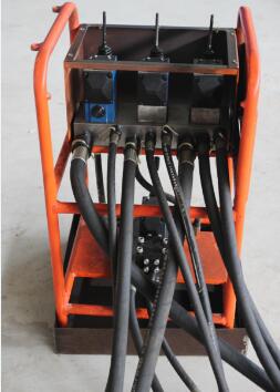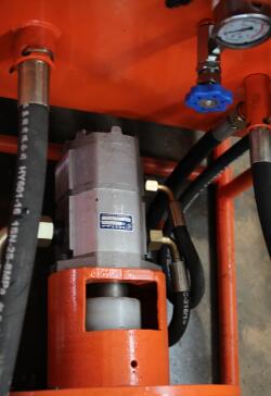 全机由主机、操作台和泵站三大部分组成,各部分之间用高压胶管连接全机由主机、操作台和泵站三大部分组成,各部分之间用高压胶管连接。而泵站主要有隔爆型电动机、双联齿轮泵、溢流阀、压力表和油箱组成。电动机启动,液压油从油箱经滤油器进入双联齿轮泵;齿轮泵输出主泵和付泵两联高压油,分别进入控制操作台,主泵供给液压摆线马达、付泵供给推进油缸和顶紧油缸液压油。