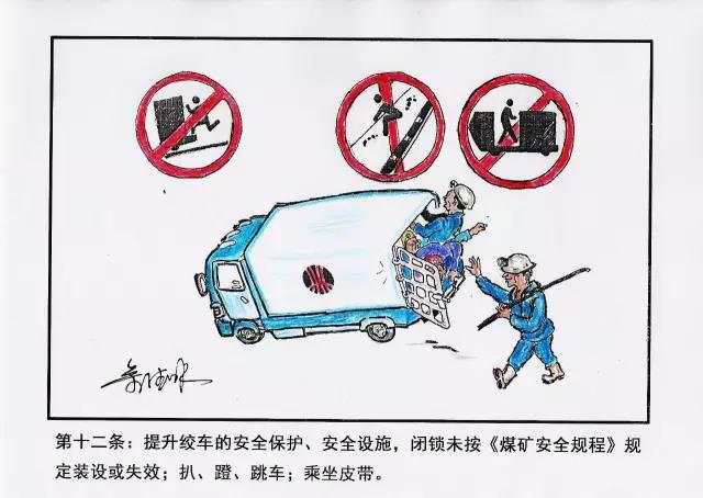 12、提升绞车的安全保护、安全设施,闭锁未按《煤矿安全规程》规定装设或失效;扒、蹬、跳车;乘坐皮带。