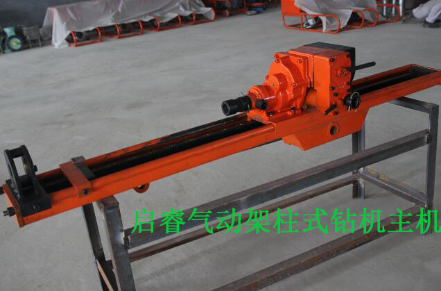 气动架柱式钻机是以压缩空气为动力进行回转钻机的煤矿设备。该系列钻机采用分组式布局,主要由回转动力装置、导轨、双立柱和 操作台组成?;刈ψ爸猛ü骞潭ㄔ诘脊焐希脊焱ü菇袈菽腹潭ㄔ谒⒅?,工作中产生的反扭矩靠架柱来支撑,大大提高了整机的稳定性及钻进效率。该钻机轻便钻进速度快,广泛用于煤矿井下探水探瓦斯钻孔。
