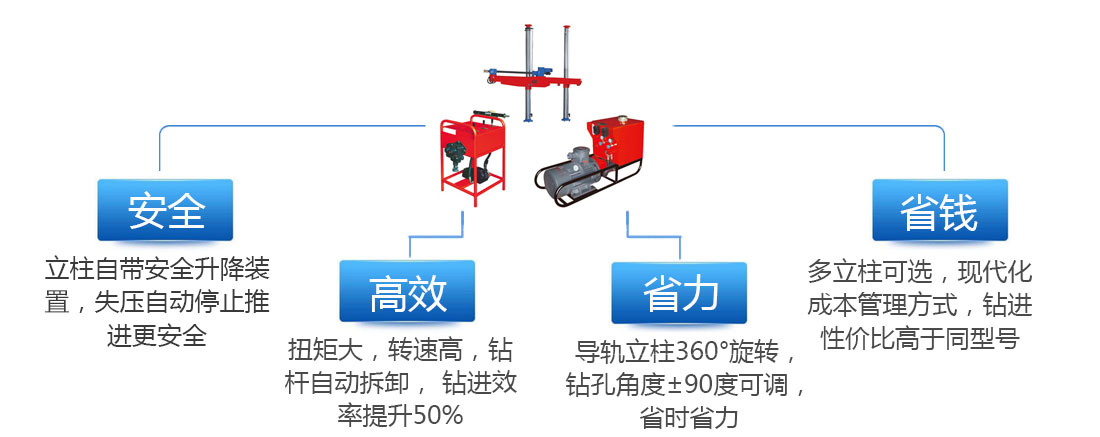 架柱式液压回转钻机是一种全液压马达回转式钻孔设备,液压马达通过回转装置的输出轴带动钻杆、钻头旋转,从而实现了切削破岩。该钻机破岩速度快,钻程长省时省力,工作效率高。可钻全煤层近水平定向孔,孔深达200米。时效20米/时。架柱式液压回转钻机在实现钻进速度、效率、钻孔角度可调、安全性等功能的基础上,采用积木式结构,将机型做到极简,立柱支撑、横梁承载钻进主机,泵站、操作台分体,既降低钻机机重,煤矿井下搬运也方便。