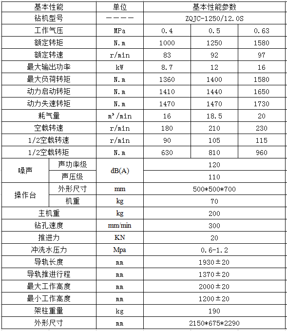 用途:ZQJC-1250/12.0S气动架柱式钻机主要是以压缩空气为动力,主要使用高效螺旋钻杆和硬质合金钻头回转钻进的动力头式钻机。该钻机为便携式,由回转动力装置、导轨、双立柱和操作台组成。它具有安全防爆、转矩大、转速高、质量轻、体积小、效率高、结构简单、维修方便等特点。适用于探测地质构造煤层、探放水、抽放瓦斯、煤体注水、卸放压力孔、巷道贯通超前孔、巷道锚杆支护孔及其他特殊用途。该机工作效率高、进尺费用少、成孔质量高、工人操作劳动强度低,是煤矿行业必备设备之一。